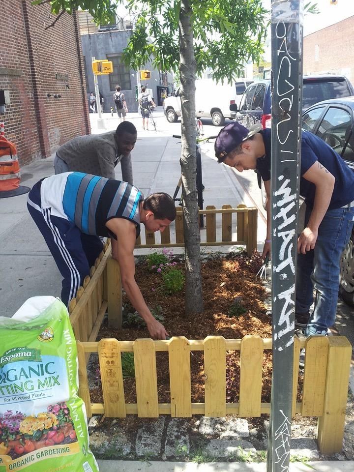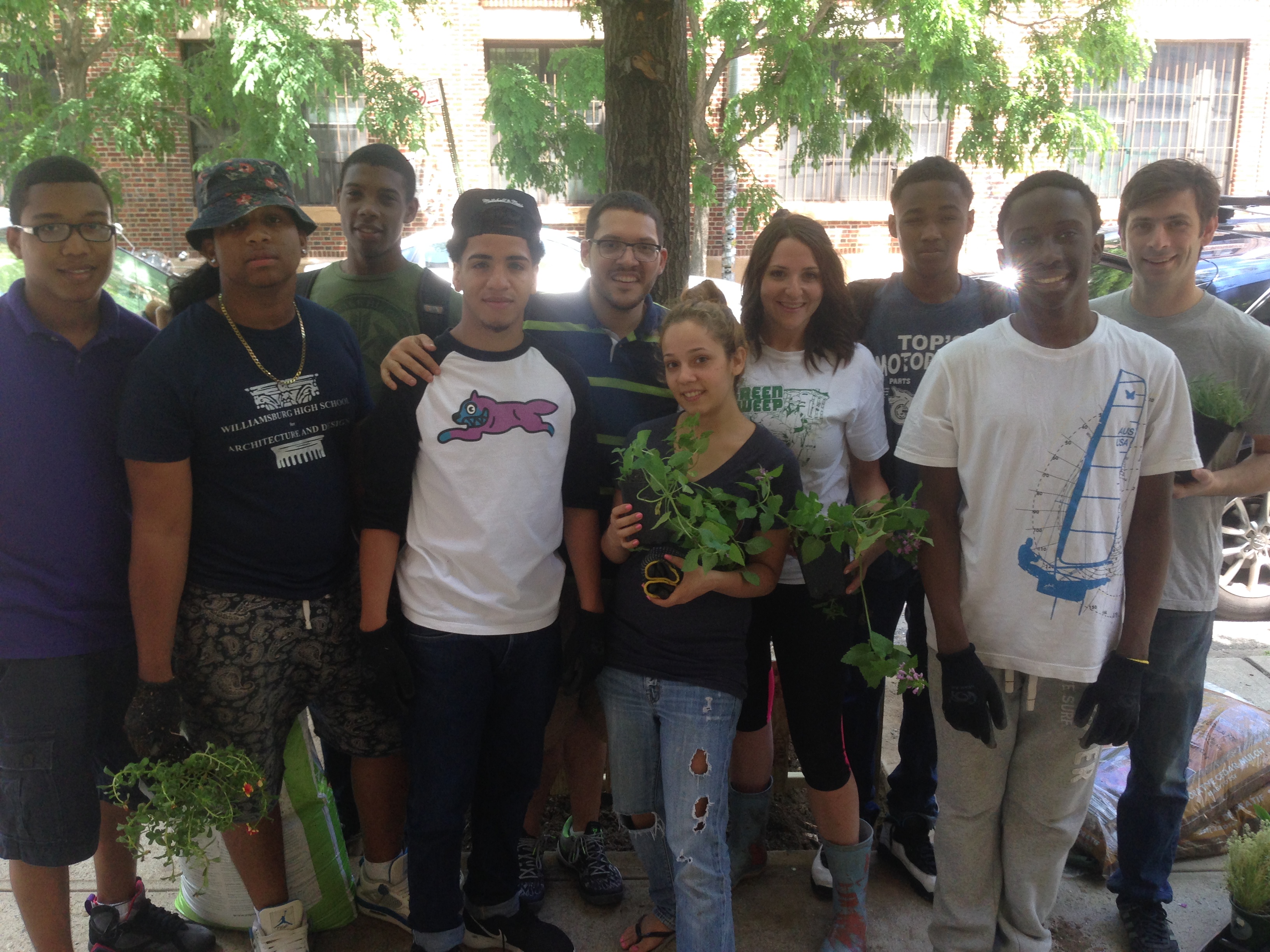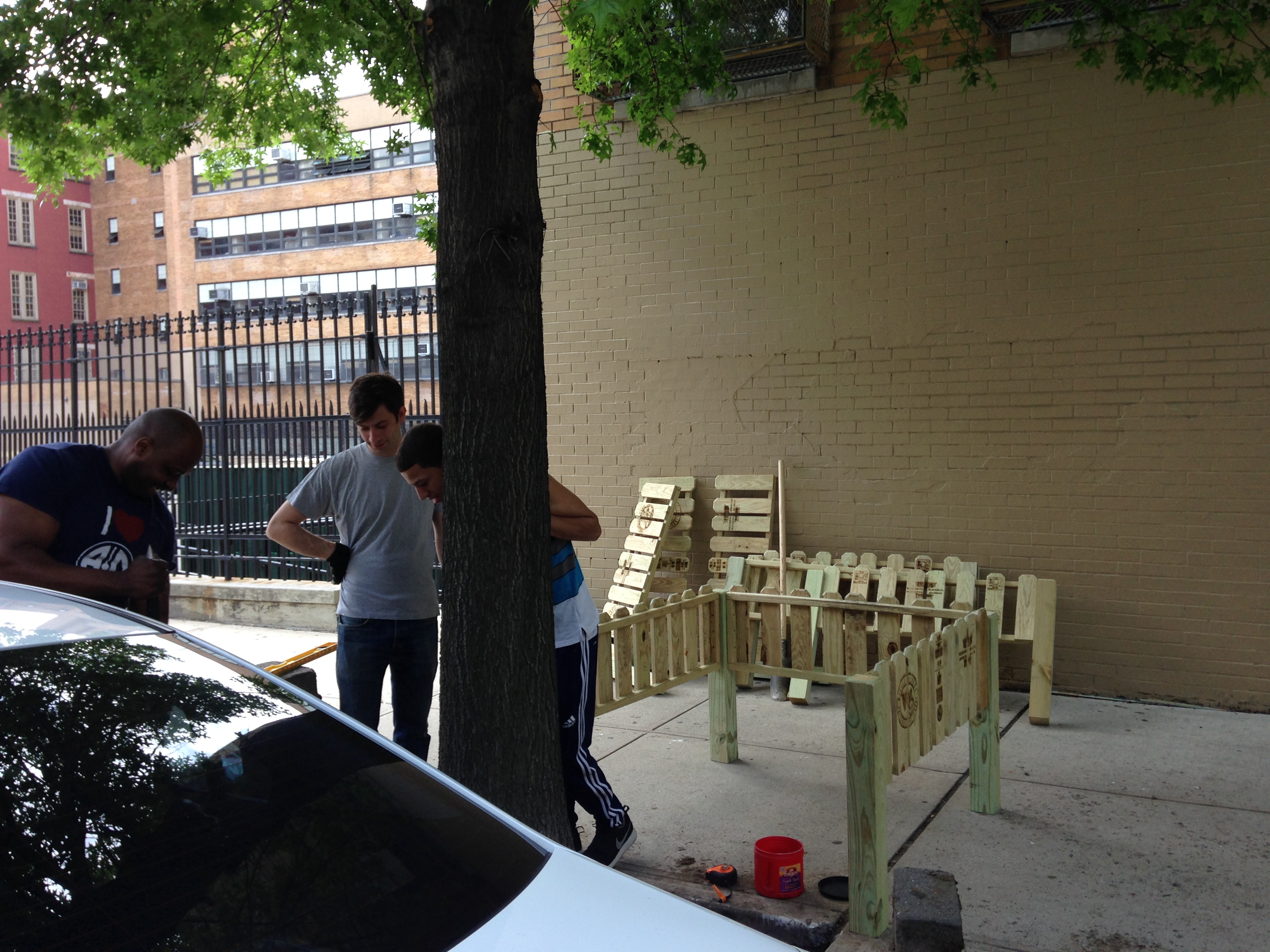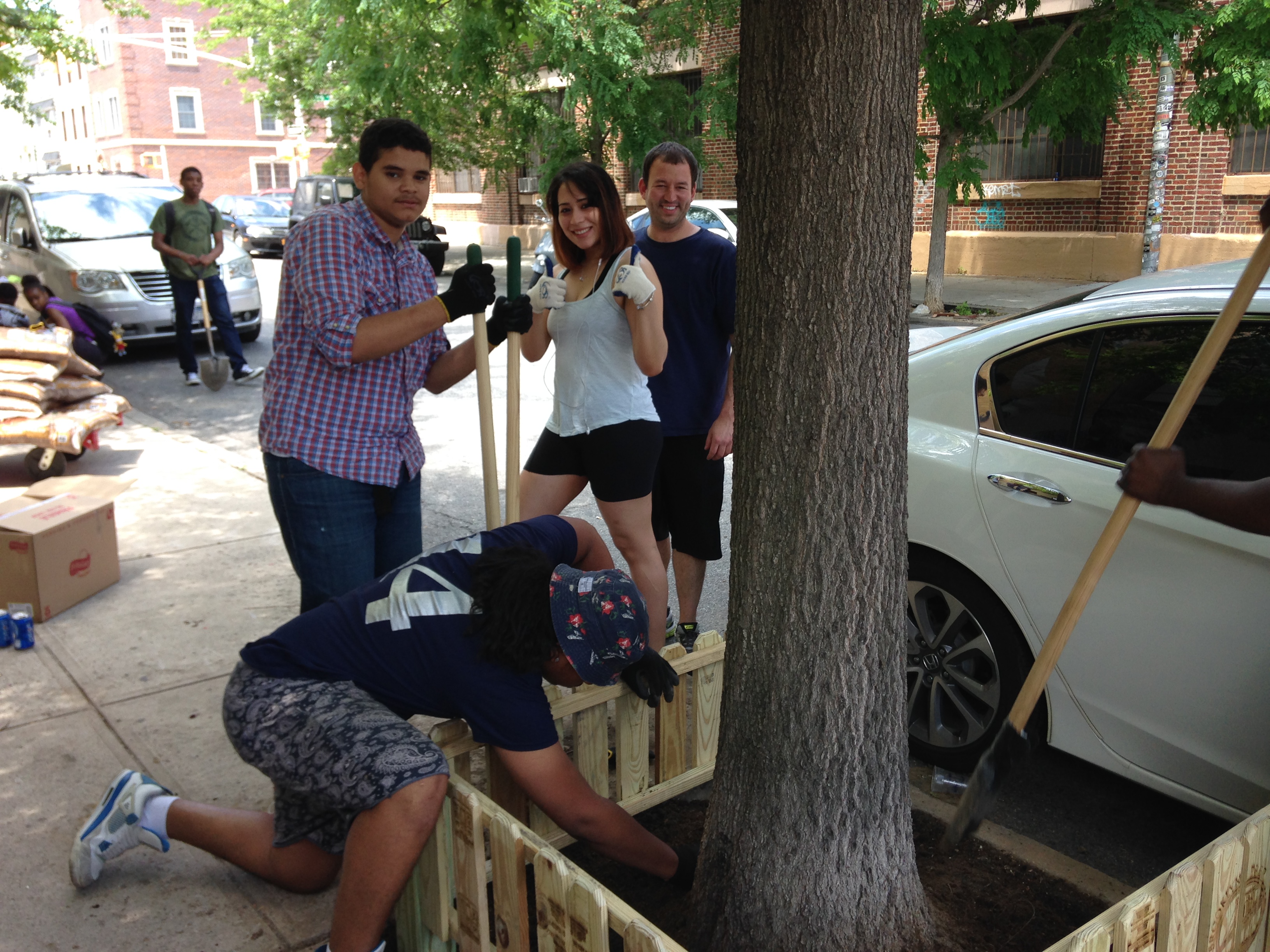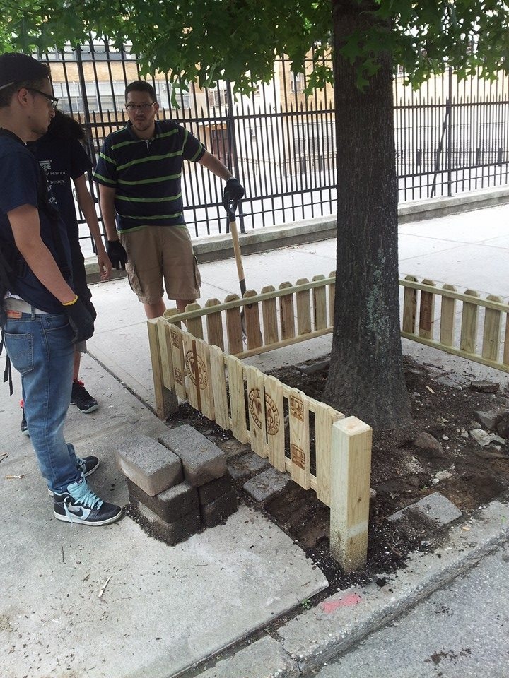 The final phase of Operation Teach.Learn.Grow kicked off on Saturday, June 14th when WHSAD students were joined by Council member Steven Levin to assemble and garden the remaining 15 Walentas Family Foundation tree guards. On their last weekend as WHSAD Seniors 15 upper class-men began the effort early in the morning, but as the day progressed and Regents prep ended the number of students working on the community service project reached to about 40 students. The tree guards are located along North 7th Street between Roebling and Havemeyer Street, in front of Brooklyn Bowl and Charlotte Patisserie on Manhattan Avenue. The tree guards are in addition to those that have been assembled by the North Brooklyn Development Corp, the Polish Slavic Center, and the Greenpoint Youth Court. On a bright Saturday morning that was perfect for gardening the students received a workshop on tree care skills led by Council member Levin’s Environmental Policy Advisor Lisa Bloodgood. Dana Rachlin of the Greenpoint Chamber of Commerce worked with students and the designers to select businesses for this project. Mr. Codio, Mr. Jones, and Senior Randy Morfe led the students in the assembly and design phase of the project. A Special Thank You goes to the Walentas Family Foundation for funding this community service project and WHSAD’s Machinist, Tommy Sheridan for cutting all the wood and working with Mr. Codio on streamlining the process.