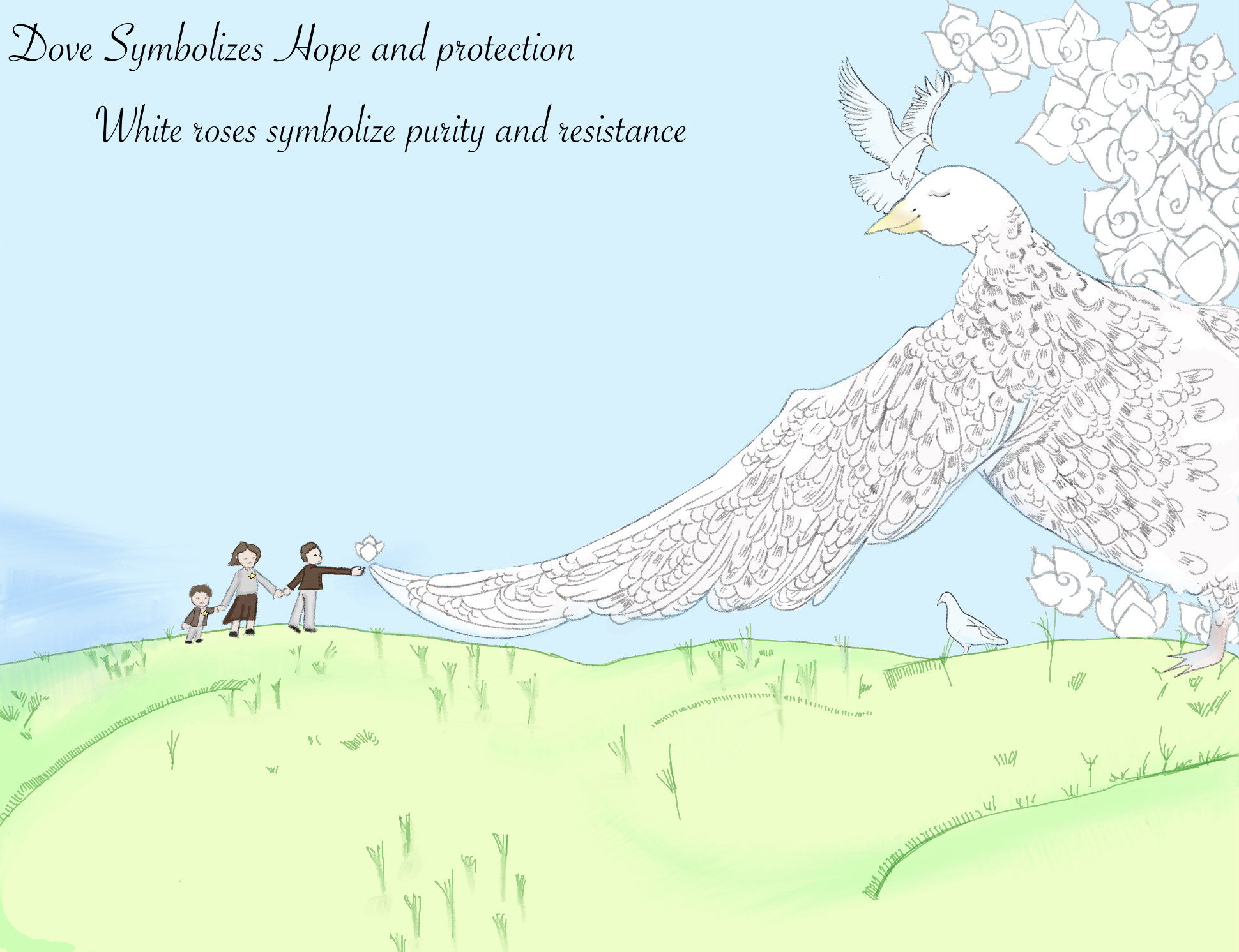 The dove represents hope but also the idea of protection. The white roses that surround the dove from behind symbolize purity and resistance. They serve as a way to show the unstoppable strength and resilience of those who lived through such traumatic experiences. The children who are seen reaching towards the dove are depicted in a setting with light, calm colors that can give others a sense of innocence and tranquility. The children each wear a Star of David, a reminder of their identity and the discrimination they went through. The dove’s gentle gesture towards the children illustrates hope and protection, giving them a sense of safety and comfort. It’s almost like distracting the children from the horrors so they can be children.