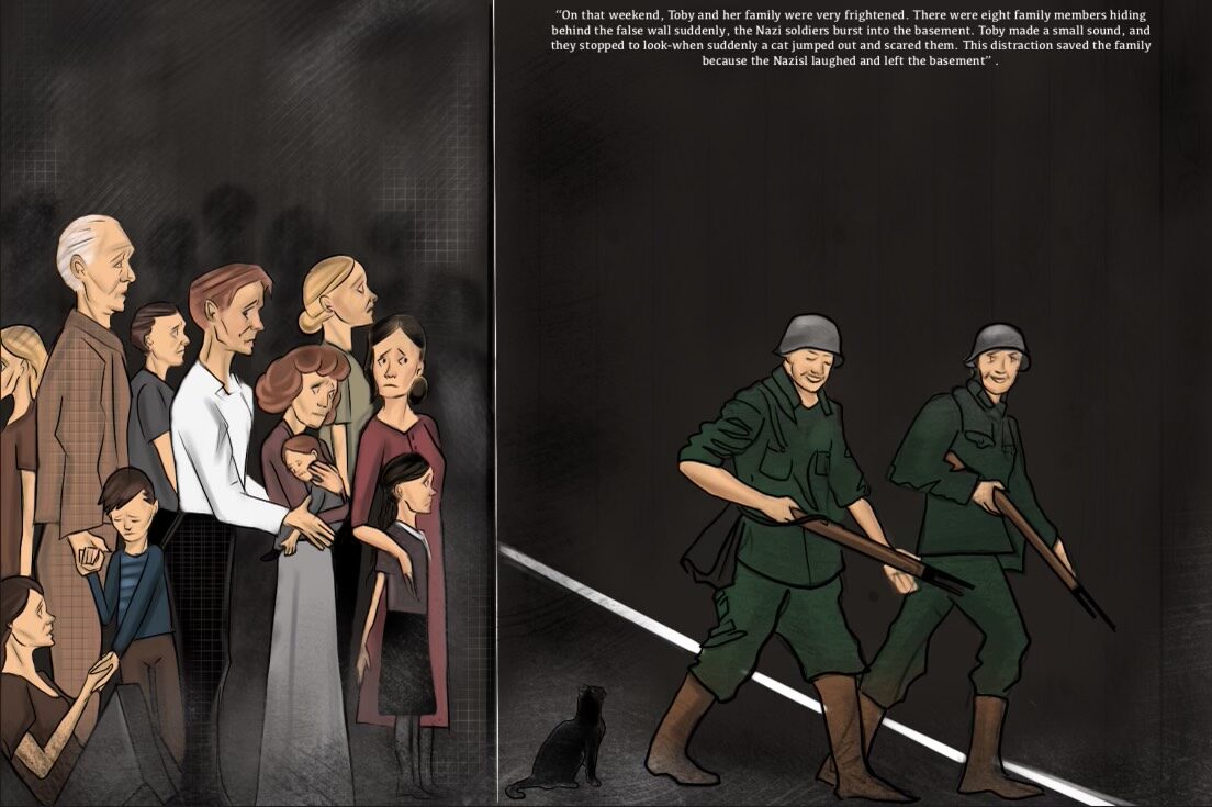 We were tasked with expressing scenes from the biography. I chose the moment when Toby and her family faced imminent danger while in hiding. In a cramped basement, eight family members trembled behind a false wall as Nazi soldiers stormed in. Toby’s small noise threatened to expose them, but a sudden, unexpected distraction a cat leaping out saved them. The soldiers, momentarily amused, left without discovering the hidden family.