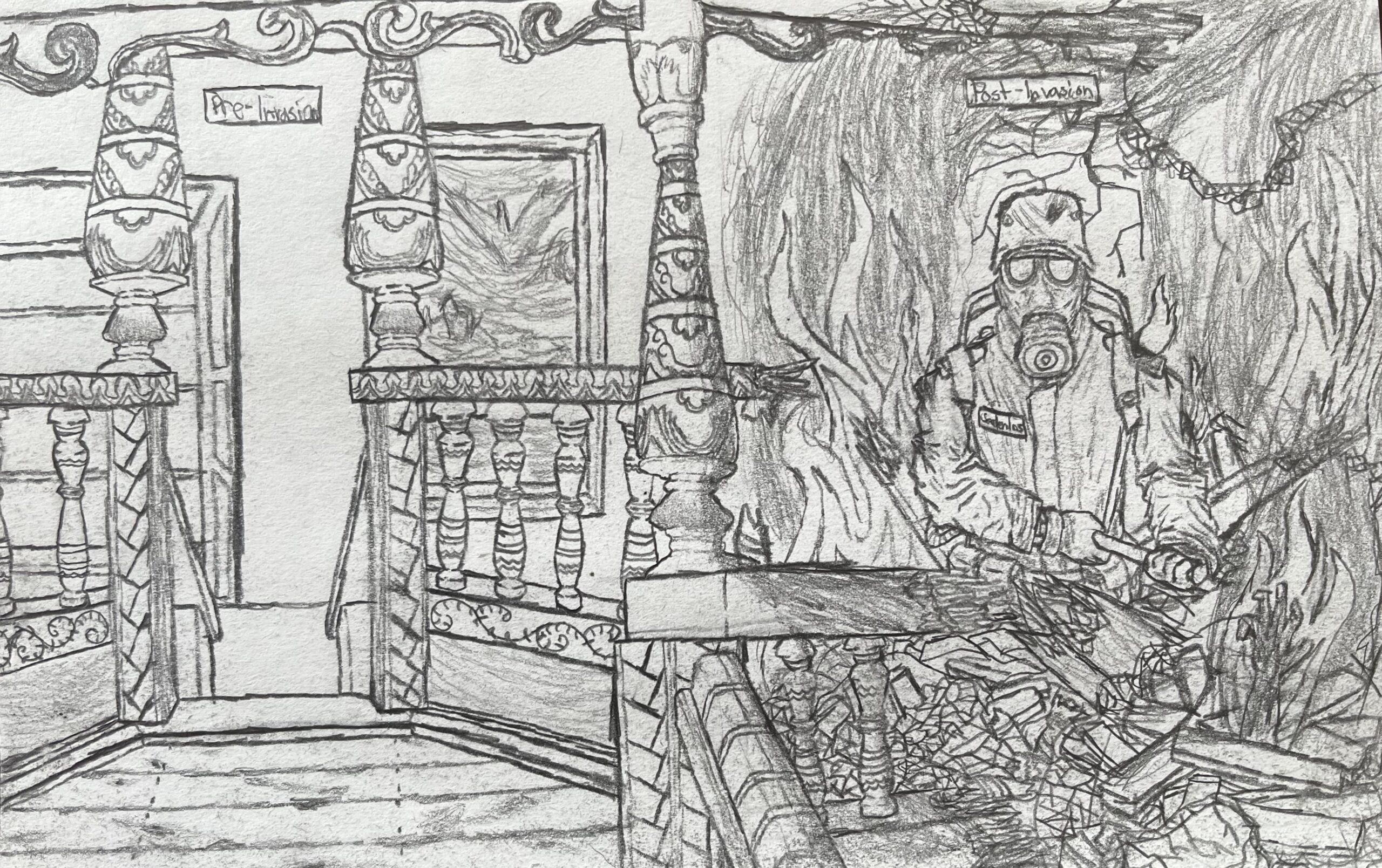 As I imagined this scenario, I could feel the family’s desperate scramble for safety and quiet and the evident horror overwhelming them. But even in the middle of the horror, there was a light of optimism because of each other and the cat’s fortunate intervention, which gave them the confidence that they could survive even the worst of circumstances. In my drawing, I portrayed them huddled closely, looking at one another for comfort and safety. While a faint light suggested the strength and hope that kept them going, the dark shade highlighted the weight of their terror and the uncertainty of their circumstances.