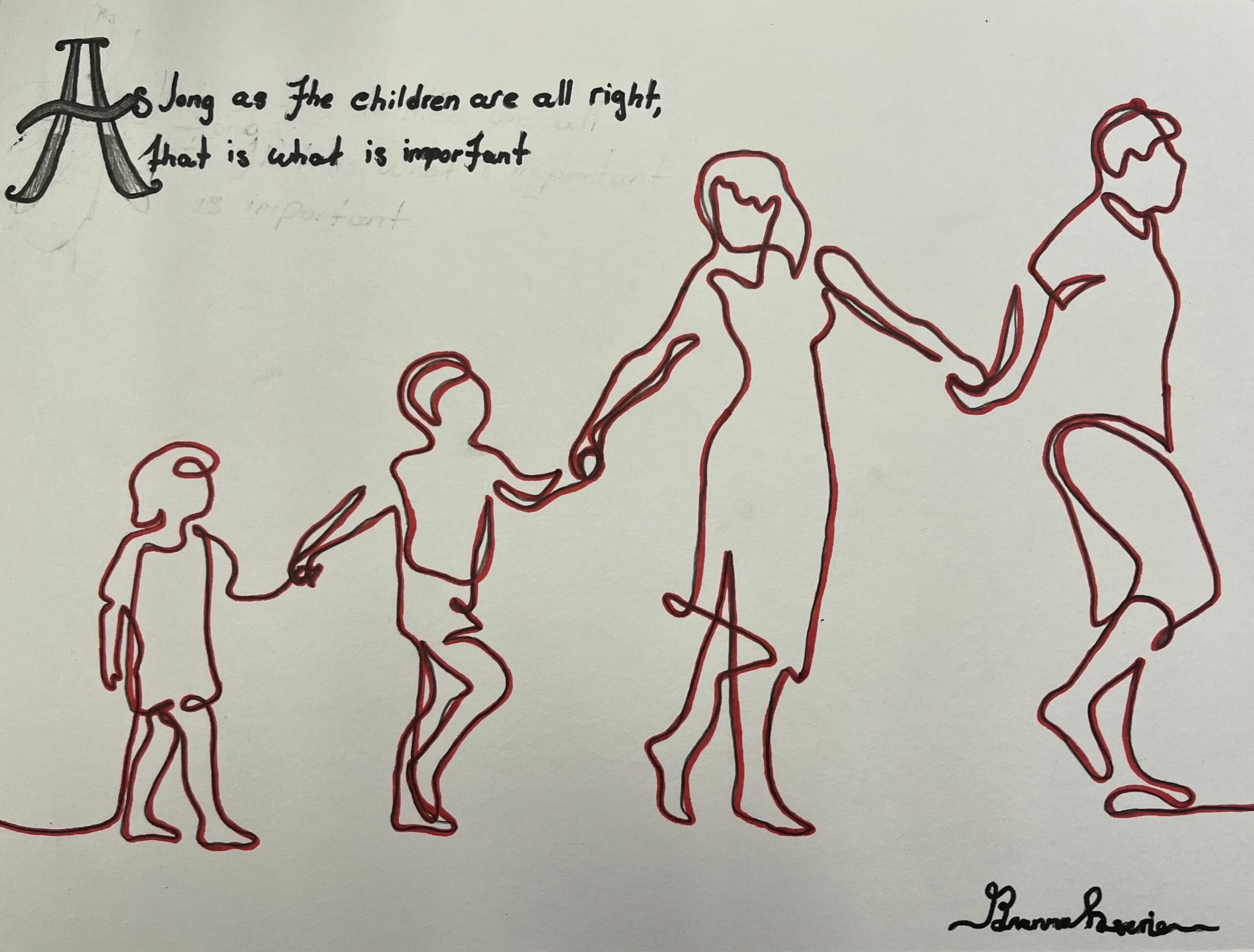 This artwork emphasizes the importance of children’s well-being. The parents can be seen holding each other with their children behind them. However, by putting the parents in front of the children, this shows how the first thing on a parent’s mind is sacrificing themselves for their children. Especially because in the black text it says, “As long as the children are all right, that is what is important.” This comment shows that the parent is more concerned about their children than they are for themselves. Furthermore, the red line stands out to represent a united family, connected hand-in-hand. The background is white, allowing the red drawing and black writing to stand out. Overall, this suggests the collective responsibility in ensuring that children thrive.
