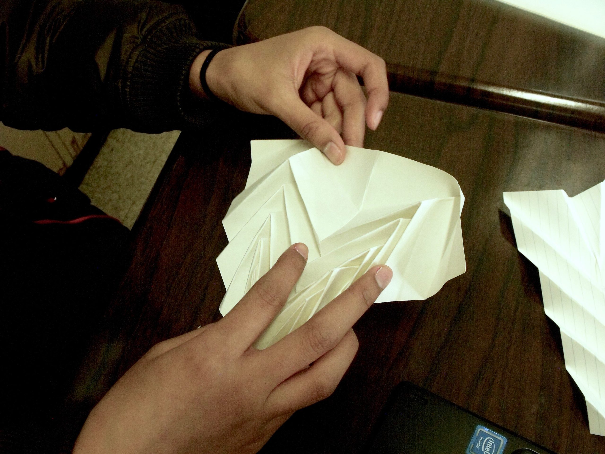 During class 2, students explored the origins of paper, as well as cut and reverse folding patterns. Patterns such as the valley and mountain folds are illustrated to permit movement while preventing wrinkling or distortion of the paper between the folds.