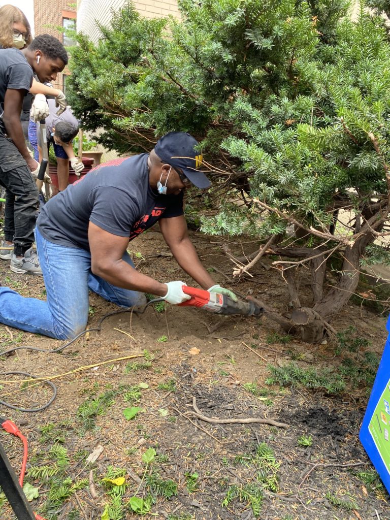 During Summer Bridge the SYEP and Summer Bridge students decided to take on the project of fixing up the garden space in front of the school. Before we did any work to the overgrown and dead bushes, we had to pick up the trash from the floor and rip out the weeds from the ground. Once we were finished with the weed pulling, we used trimmers to even out the bushes and cut off the dead and dry branches. Some of the branches were too thick to use the hedge trimmers, so senior architecture teacher, Mr. Codio, came in with the electric saw to cut them off. Throughout the experience it reminded me of Mr. Miyagi cutting bonsai trees. One of the hardest things in this project was pulling unwanted roots out. They were very difficult because we had to use the shovel to dig the space around and use hedge trimmers to cut them. Overall this was a fun experience. I really enjoyed working with my fellow SYEP and Summer Bridge students helping build a cleaner and better looking front space.”