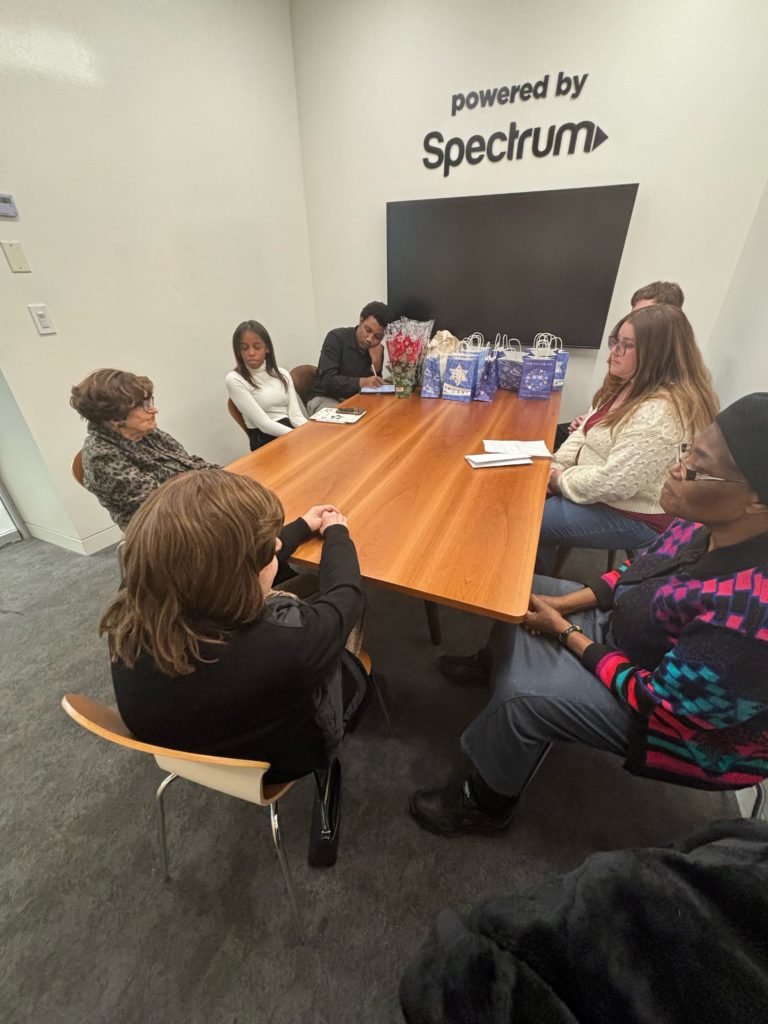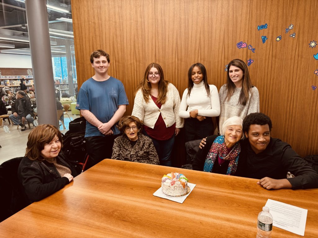Jack Tavin, Toby Levy, Hadassah Carlebach, and Sarah Chaikin spent some time discussing their experiences, but most of the afternoon was spent with the young people chatting with the survivors about the holiday season. Students learned about Hanukkah traditions and shared with the survivors their future goals in academics and career. The time together came to an end with a celebration of Mrs. Levy’s 90th Birthday.