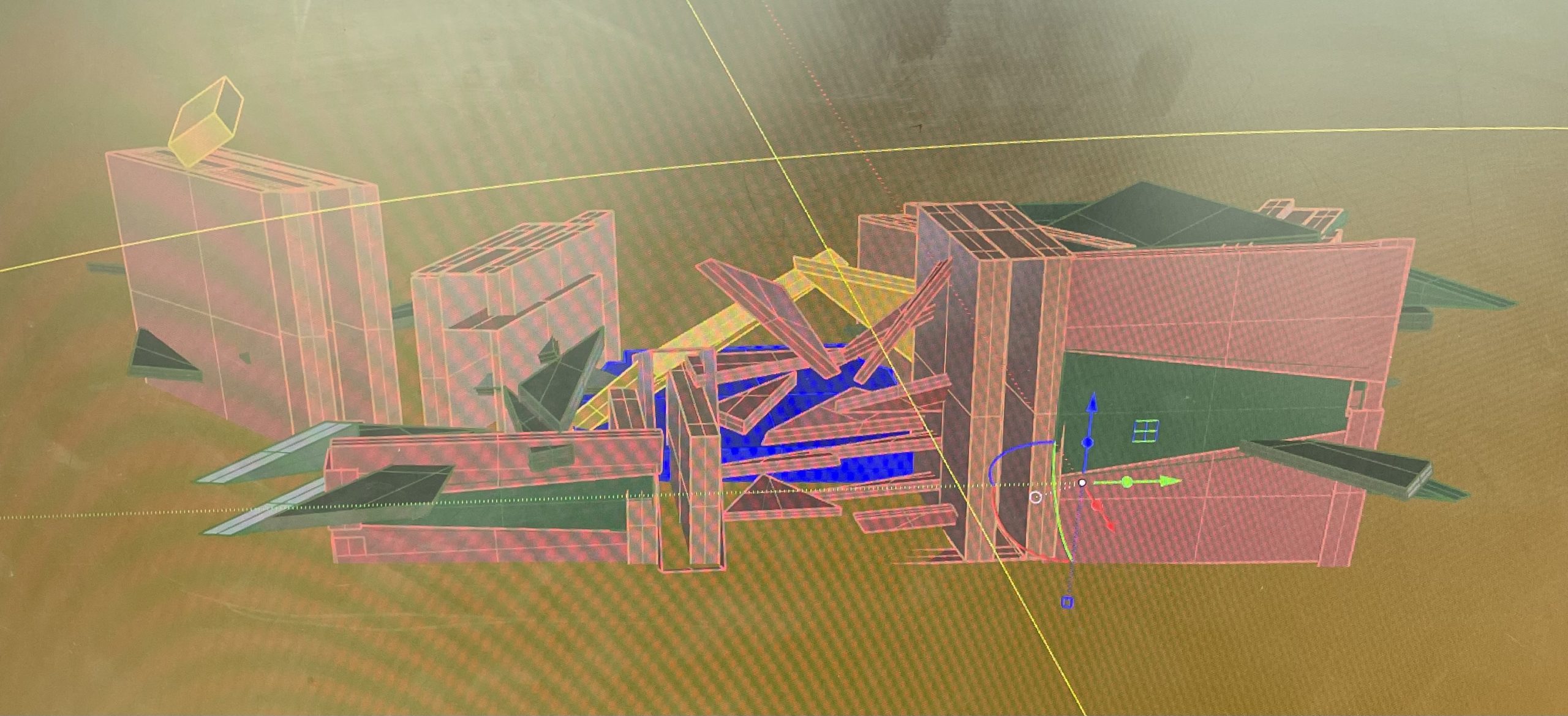 I distorted and twisted the images of my living room window to create it. For my physical model I printed out my Photoshop collage to cut out the geometric shapes on chipboard and then played around with their placement and placing some at an angle. Once I got to the digital modeling phase, I found that I wasn’t really happy with the way my physical model came out, and so I took the liberty of making some changes. For each of our models we were assigned with a biome and with this information we were asked to add some features that would resemble a structure in this biome. I was assigned a desert biome and the features I added were pillars, since that was what I associated a desert biome with. When I was finally happy with the model, I added some textures and material to it so that it could look like a space that someone could actually be in.