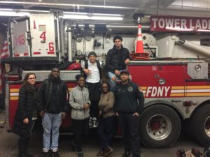 This holiday season WHSAD students are using their time to collect canned goods for the hungry in our community. As part of the initiative, students created boxes for each classroom, publicize on a daily basis, and collect during each day’s fourth period. Yesterday, December 18th, had a few of WHSAD’s seniors, along with teachers and H.E.A.L.T.H. for Youths partners, dropping off some of the collected cans at local firehouse Engine 229/Ladder 146. There, the students had a chance to meet a WHSAD alumni of the graduating class of 2008, Antoine Lamaison, who serves as one of New York City’s bravest.