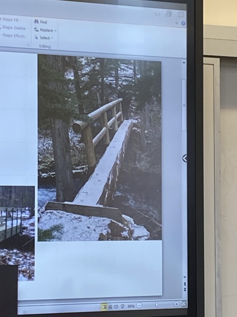 After that we learned more about the different types of bridges. There’s so many different shapes and sizes so some can look like planks, others like spiral stairs, and others like normal bridges. To hold the bridges most of the time sills, stringers, decking, and even railings are used. The stringers and the sills are often used to place a bridge and prevent it from moving or falling. The railings could be used more to prevent people from falling down and to create a more safe spot. The assessment that we got afterwards was to answer questions about the bridges that they showed us. Each group got assigned a different bridge. I was in group 2 and we got the bridge with the thin plank and one railing on the left side. I thought that it looked a bit thin and unsafe to use because of the one railing it had. We had to analyze the bridge and write about what we think that the impacts of species would be along with mobilization impacts, maintenance needs, and the aesthetics. I wrote that it wouldn’t cause much of an impact because of its size and the materials that it’s made of. But apparently this is wrong because it will actually cause big changes to the surroundings along with great mobilization impacts. The bridge will actually need maintenance so that it’s kept clean and no garbage gets on the plank, but other than that the bridge actually seemed to fit perfectly into the aesthetic in the image.